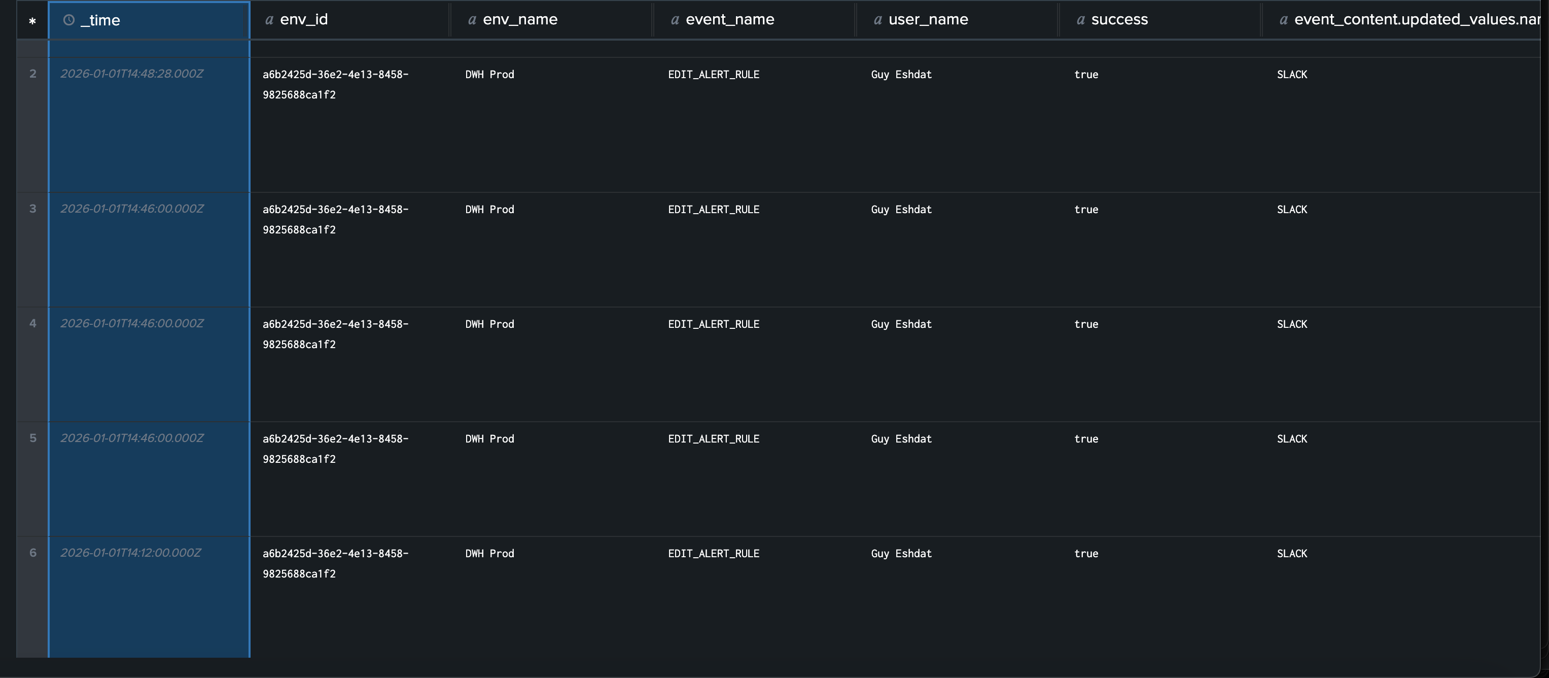 timestamp: ISO 8601 timestamp of the event (UTC)log_type: Either"audit"for user activity logs or"system"for system logsevent_name: The specific action that was performed (e.g.,user_login,create_test,dbt_data_sync_completed)success: Boolean indicating whether the action completed successfullyuser_email: User email addressuser_name: User display nameenv_id: Environment identifier (empty for account-level actions)env_name: Environment name (empty for account-level actions)event_content: Additional context-specific information as a JSON object